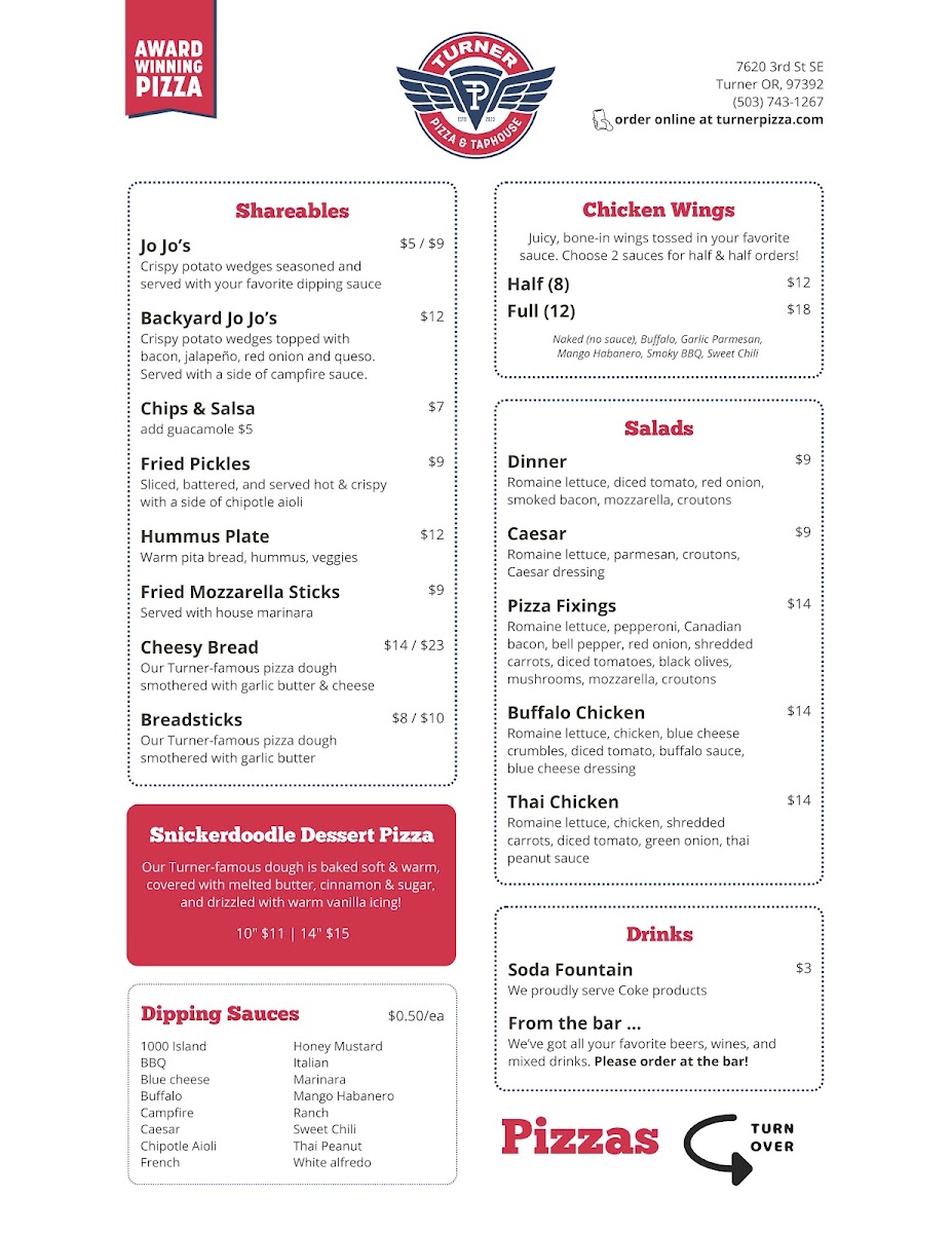 Welcome to Turner Pizza & Taphouse, a delightful culinary gem nestled in Turner, Oregon. This inviting eatery boasts a menu filled with mouthwatering offerings that cater to diverse tastes. With a variety of fresh salads, from the hearty Pizza Fixings Salad to the classic Caesar, there’s a perfect start for every meal.